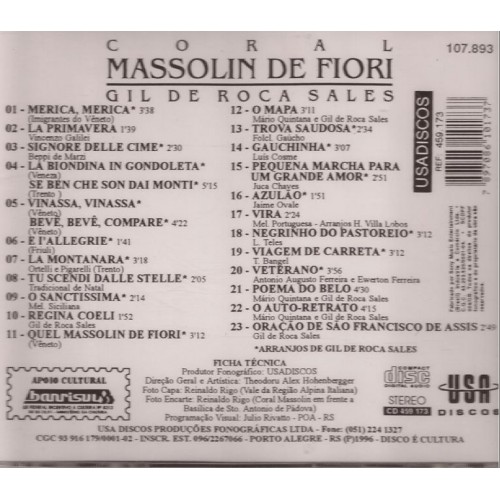 Este CD denominado de Coral Massolin di Fiori sob regência do Maestro Gil de Roca Sales é composto por 23 canções em Língua Taliana.